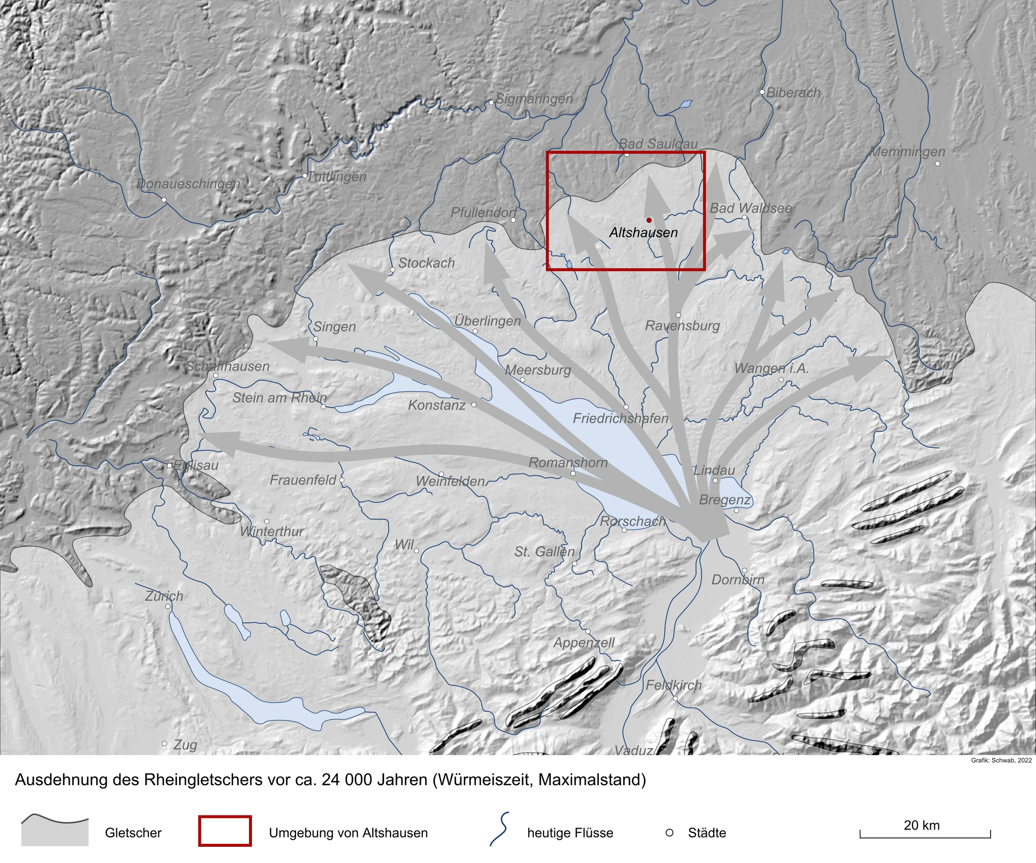 Die folgende Karte zeigt die gewaltige Ausdehnung des Alpenrheingletschers bei seinem Maximalstand während der letzten Eiszeit.